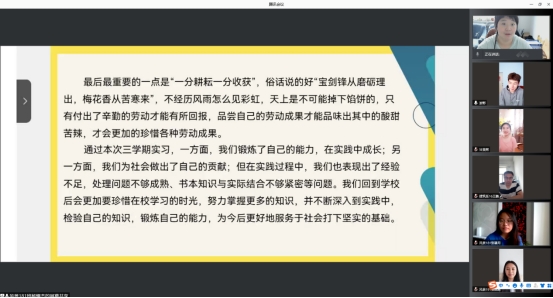此次答辩工作,3-4名同学为一个小组分批次向老师们汇报自己这个第三学期在实习岗位做了啥、学了啥,充分体现了风景园林专业学子在学中做,在做中学,坚持不断在实践中增长才干的奋斗精神。答辩过程中,宋兴蕾老师详细询问了同学们在工作上的细节,向同学们指出日后还需要努力的方向。风景181班杨耀杰同学在汇报中说到:“通过本次第三学期实习,一方面,我们锻炼了自己的能力,在实践中成长;另一方面,我们为社会做出了自己的贡献。”并表示:在回到学校后要更加珍惜在校学习的时光,努力掌握更多的知识,并不断深入到实践中,检验自己的知识、锻炼自己的能力,为今后更好的服务社会打下坚实的基础。答辩最后,宋兴蕾老师对同学们的工作表示肯定,提醒同学们假期要做好疫情防控工作,并祝同学们假期愉快,调整身心,准备迎接新的学年。