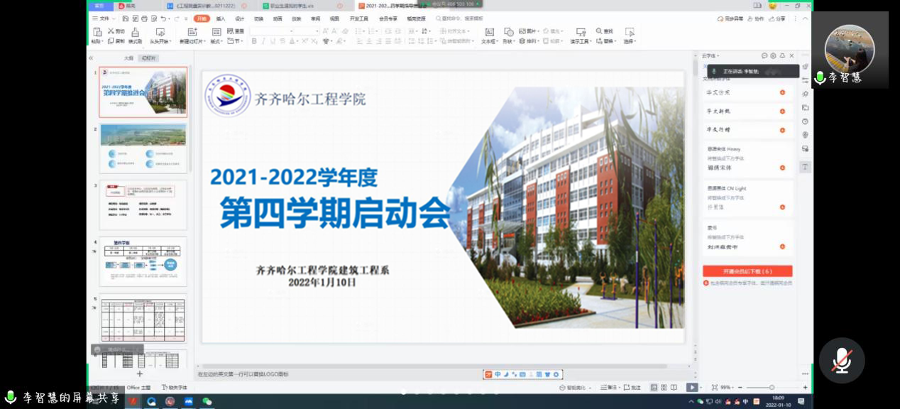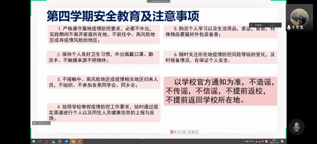 2021-2022学年第四学期已经正式开启,本着勤于思考,勇于实践,善于总结地开展第四学期的初衷,学生职业生涯导师李智慧组织所负责的23名学生于1月10日下午在腾讯会议平台召开本次第四学期启动会,会议由指导教师李智慧主持,党员学长柴宇娜也列席本次会议。