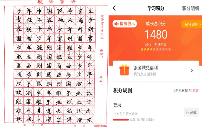 我们小组在这一周进行了钢楷描摹和学习强国两个任务的学习。通过自己的亲身感受在本周既锻炼了自己的书写能力,又增长了不少强国知识和爱国情怀。这一周的学习可以使我们增长见识、可以提高我们的书写能力。完成任务的过程中我们明白了:生活中有很多事情等待我们去做,如果只是为了完成而完成,完成后不思考那么你将一无所获。如果为了学习而完成,完成后进行反思你将受益匪浅。