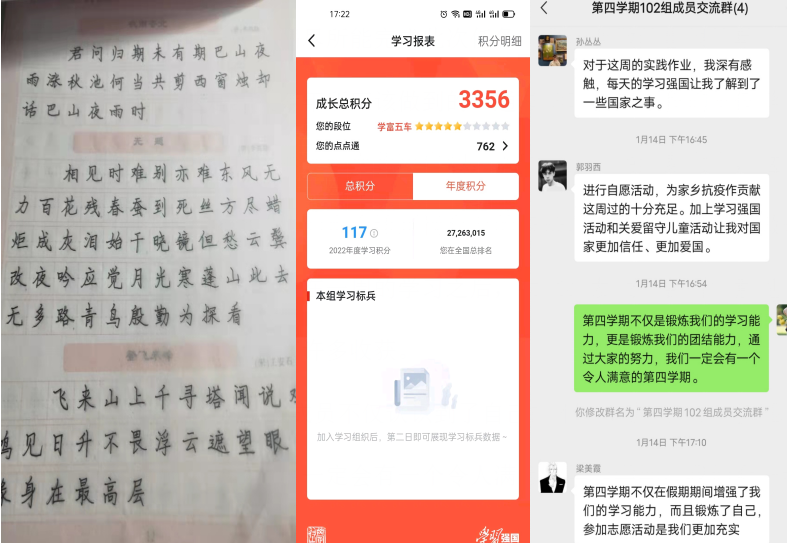 我们小组共有四名成员,分别来自不同的地方,因为第四学期任务,让我们分在一起,我们一定会竭尽所能完成此次任务。我们要做的也很简单,每天打卡学习强国,这是当代青年所应该做到的。通过学习强国,我们不仅学到了一些地理知识,也让我们的视野变得更广阔,能了解到一些国家大事,这并不是一件什么坏事。同时,我们也应该正视自己的身份,在什么阶段应该做什么事,这是我们应该清楚的。在一周的学习之后,大家都发表了各自的意见,想必都从第四学期的学习中有许多收获。