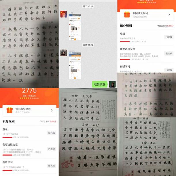 这是第四学期正式开展的第一周,本周第二组的学习内容为学习强国和钢楷临摹,成员们每天按时反馈且完成情况良好。大家均能完成学校布置的任务,即每日一页字帖与每日学习强国积分计划。由于疫情防控常态化影响,目前我们无法进行志愿服务,因而我组成员都各自在家完成每日学习强国和字帖的任务。