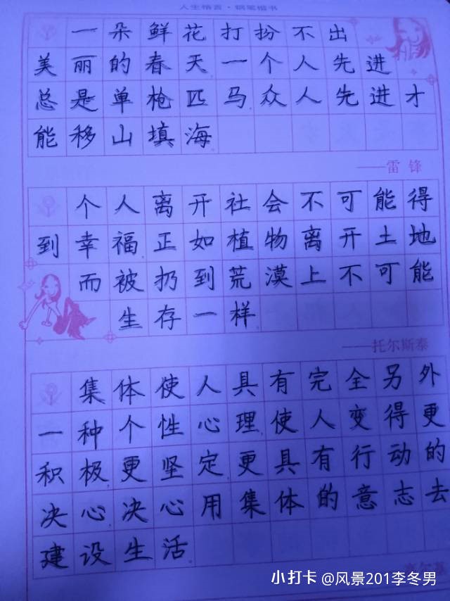 本周是第四学期开始实施的第一周,为更好的丰富学生的社会阅历,增强学生的社会责任感及人文修养,提高学生的综合素质等优良品质。建筑工程系第89小组成员风景园林201班罗艳阳,风景园林201班冯格格,风景园林201班李冬男,风景园林201班罗皓完成了钢楷,书法临摹以及学习强国积分的任务。