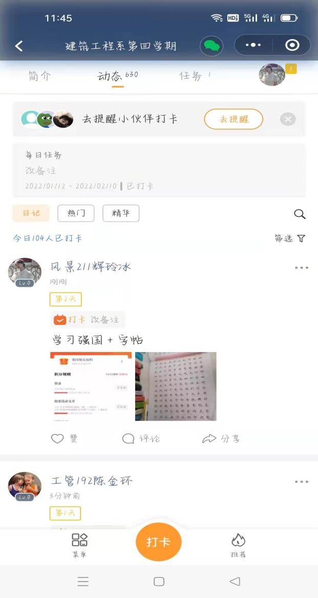 我校为丰富学生的社会阅历,增强学生的社会责任,提高学生素质,2022年1月10日正式开展第四学期实践活动。建筑工程系第91组成员风景211朱紫涵,风景211辉玲冰,风景211马婉茹,风景211胡庆权在第一周按时完成本周第四学期安排,坚持每天写字帖和学习强国,并积极参与配合汇总学习成果。根据地区疫情防范情况,部分小组成员参加社区志愿者活动。