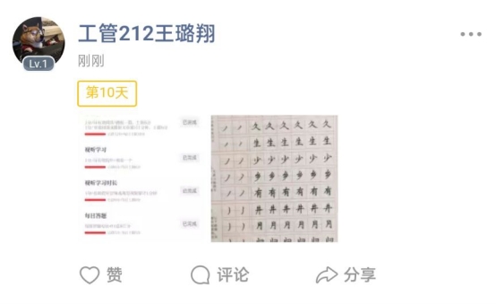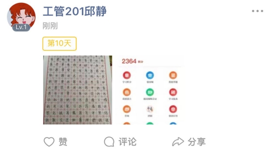 本周是第四学期开展的第二周,小组成员工管201邱静、工管212王恒、工管212王璐翔、工管211姜小松。在本周,本组成员进行了通识项目中的钢楷临摹和学习强国。书写会伴随我们的一生,而钢楷临摹,是练好字的第一步,也是最有效的基础书写锻炼。而学习强国呢,不仅仅能够拓宽我们的视野,了解到当今实事,还能让我们更加了解党和国家,更加富有国家责任感和民族归属感。