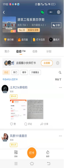 JZSQ052小组成员李珊、顾思儒、杨洋、单柏钧,第三周的社会实践活动主要通过在学习强国平台学习、钢楷临摹、居家锻炼、志愿服务、读书交流等形式进行。本周我们参加了系里组织的第四学期阶段总结大会,对比了解了我们小组与其他小组之间存在的差距,分析了存在差距的原因和我们小组成员自身存在的问题。小组内通过腾讯会议进行交流,制定了切实可行的实施方案。在小组长李珊的带领下,小组成员互相交流、督促顺利的完成了第三周的实践任务。本周我们小组共完成学习强国420分,钢楷临摹7页、居家锻炼4次,志愿活动1次,同时本周我们小组增加了读书交流活动,每位成员都撰写了一篇读书心得,通过读书交流,小组内成员都丰富了知识,也提高了团队协作的能力。