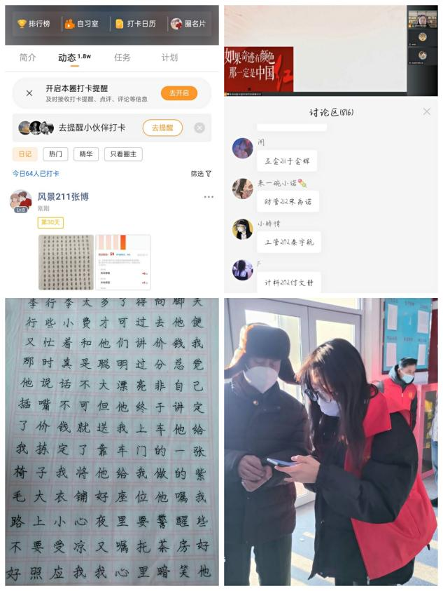 本周,小组成员每日均积极学习打卡,每日坚持完成学习强国APP上面的任务和钢楷临摹,除此之外,小组成员还进行了当地的志愿服务活动,提高了同学们的实践能力。