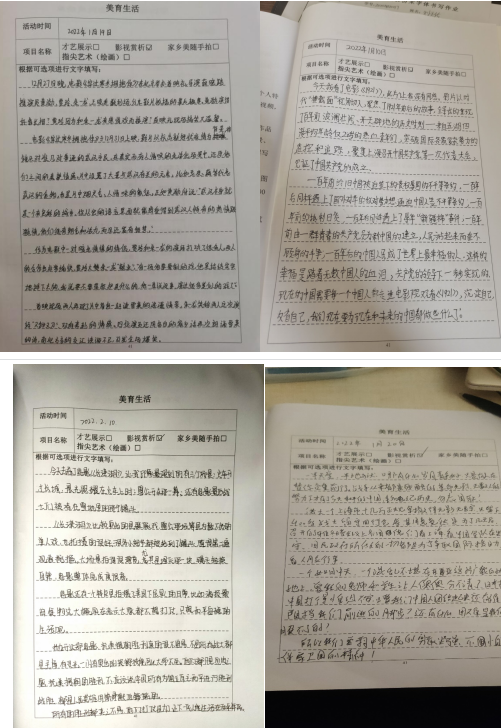 蔡元培先生曾经说过:“美育是最重要、最基础的人生观教育”。确实,美是有力量的,没有美育的教育是不完整的教育,而美育正是以润物细无声的姿态一直滋润着人们的精神家园。此次活动我组同学选择影视鉴赏来完成本次活动,我们观看红色影视作品,并将观看完的感悟写在手册,同时也从心底里由衷地为自己是一名中国人而感到骄傲!
