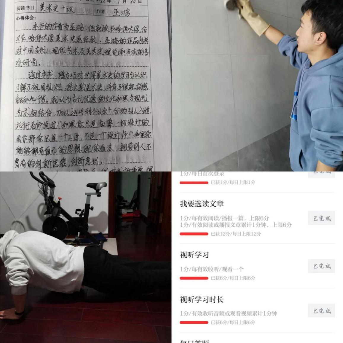 本周我们小组进行了读书交流、居家锻炼、感恩实践、学习强国等各项任务,通过读书交流是我们更加深刻认识到书中自有黄金屋的意义,社会调研使我们做事更有条理更加细致与耐心,居家锻炼使我们强健气魄,身体是革命的本钱,当代大学生和青年应把锻炼身体放在心上。感恩实践活动使我们理解父母的辛苦与不容易。当然,学习强国是我们每天都在坚持的事情,通过学习强国的平台和机会,是我们对于祖国的强大有更深层次的理解,激发广大青年的爱国热情。