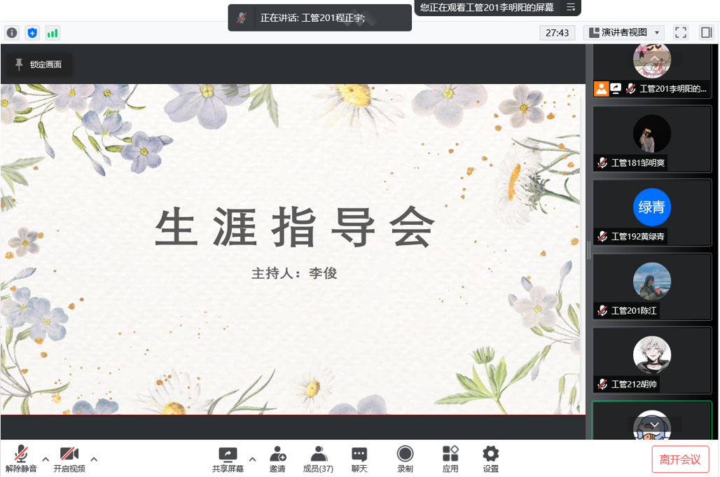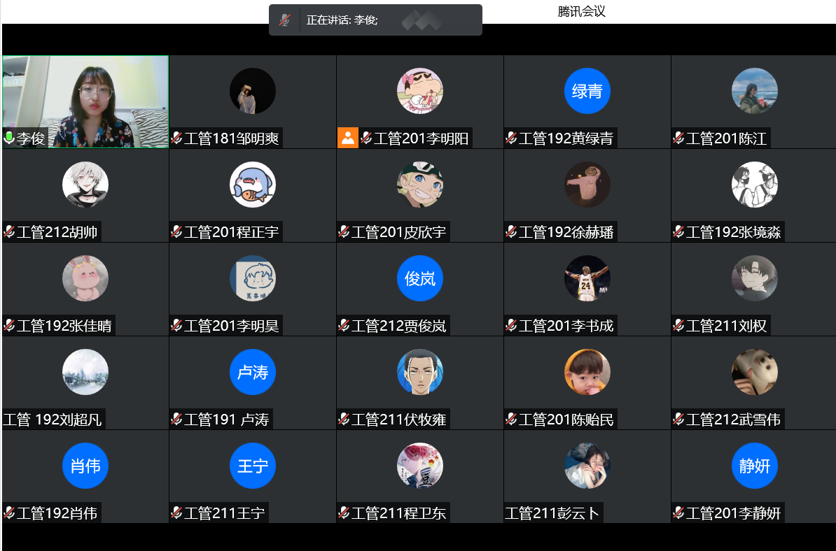 在2月12日下午17时,生涯导师李俊通过腾讯会议召开了第四学期生涯导师指导会暨第四周的学习汇报活动,会议由工管181邹明爽主持,105-114小组成员全部出勤。