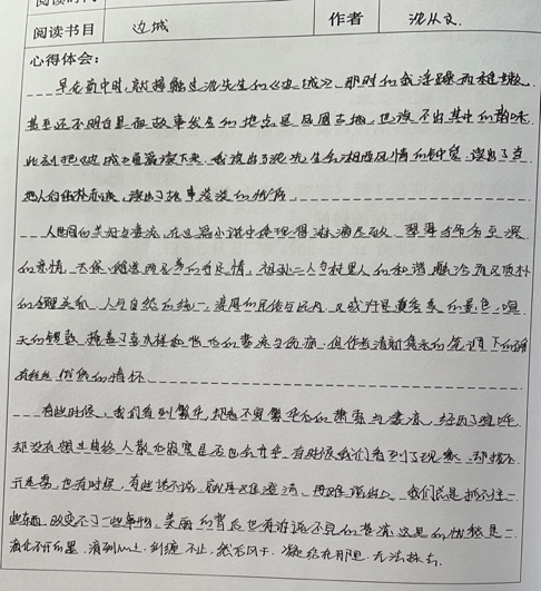 风景201刘金钰同学读完《边城》一书,仿佛看到了一副人与自然相得相融,却又流露出对于人生悲凉命运困惑的画面。土木214郑宇心同学读完《至死不渝》一书,更清晰了爱创造的奇迹是无限大的,也通过读书的过程也锻炼了推理的能力。工管212邢海月同学读完《一分钟习惯培养的》一书,坚信只要日积月累持之以恒没有什么事情是办不到的。