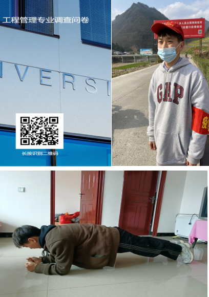 本周我们主要进行的是钢楷临摹、长仿宋体书写、学习强国的学习和居家锻炼,并且每天按时在微信小程序上打卡。在第四学期中我们不断地学习进步,同时通过居家锻炼让我们有一个强健的体魄。本周小组成员还进行了有关专业的问卷调查,对本专业的就业形势进行分析。同时小组成员工管192陈旭东在四川省广元市朝天区云雾山镇参加了疫情志愿者活动,对来往人员进行检查登记,为疫情防控贡献出自己的一份微薄之力。