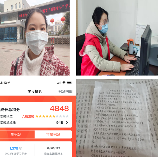 第四学期期间,小组成员积极开展各项活动,在本周,小组成员均完成最后一次志愿服务活动,其中,包括在当地社区完成疫情防控任务,在交警大队做疫情防控志愿者。除此之外,小组成员学习强国的年度积分均达到1000分左右,读书交流和钢楷临摹活动也均已完成。