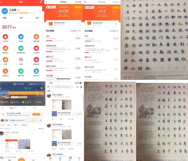 在本周,小组成员均完成了25篇钢楷临摹,且保证小组成员学习强国积分每天均在50分左右。在本周的感恩实践活动中,我们体会到了父母的辛苦,拉近了我们与父母之间的距离;在居家锻炼活动中,提高了我们的自身素质。