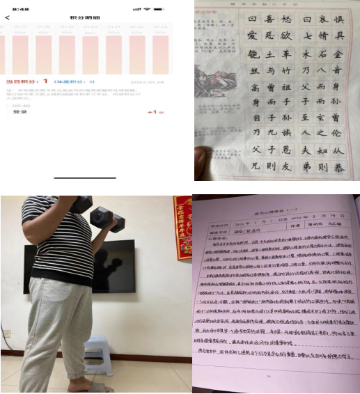 虽然第四学期的活动已接近尾声,但是28组的每一位成员依旧都能够按照第四学期的要求来完成任务,每天都会按时在微信小程序中打卡,观看学习强国,坚持每天描摹字帖,进行居家锻炼。
