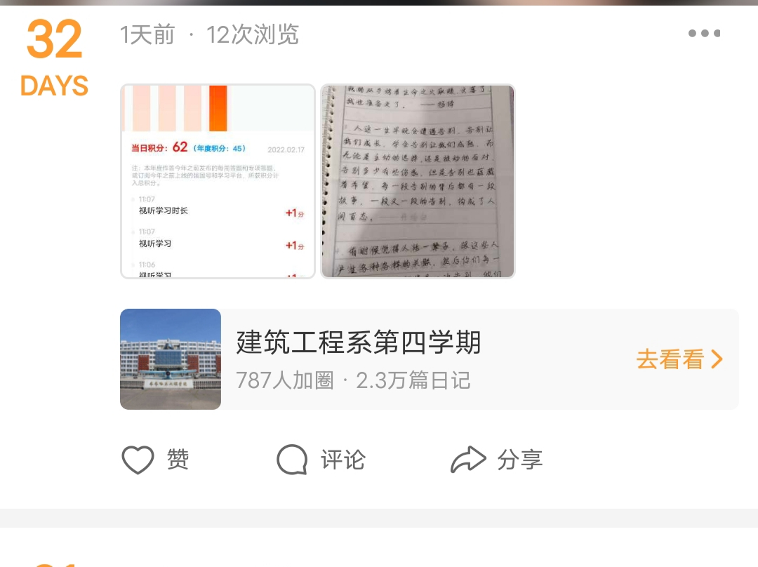这周是第四学期的第六周,本周确定活动内容为:每天一篇练字,每天学习学习强国分数至少在30分以及完成志愿等活动。