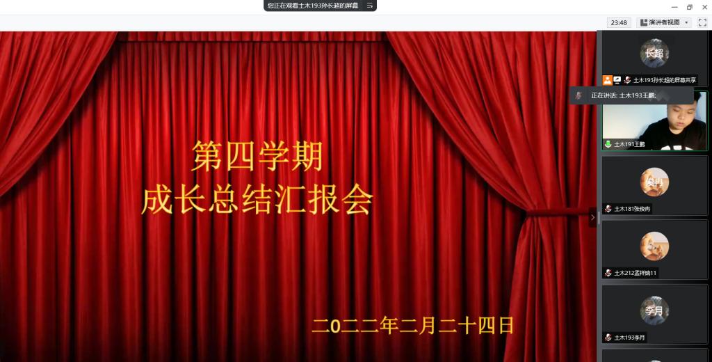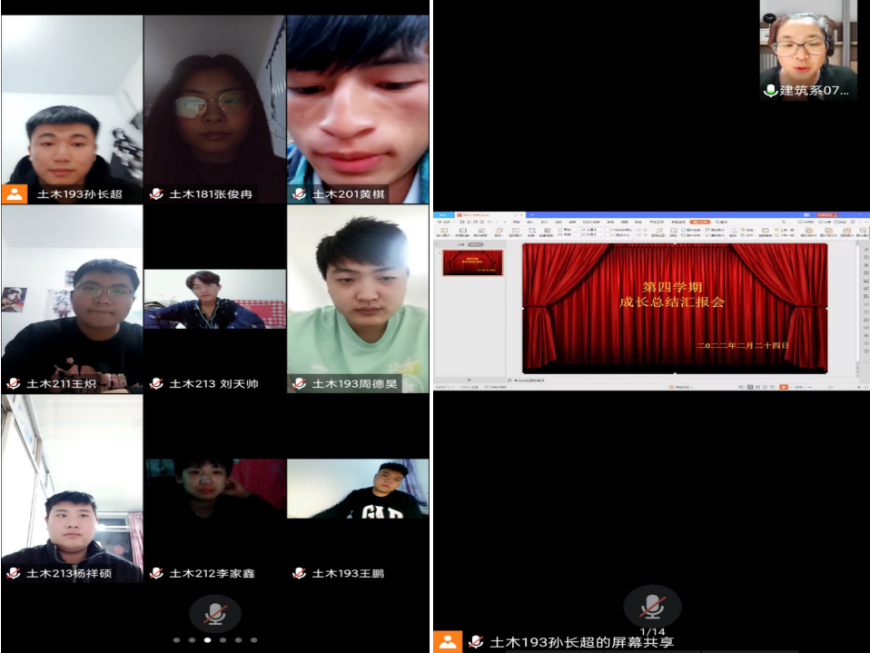 2022年2月24日晚7点30分,生涯老师赵玖香在线上召开了第四学期总结汇报会,赵玖香老师首先对汇报时要求进行了简单的阐述,接下来通过主持人依次宣布汇报顺序进行汇报,汇报内容主要围绕第四学期完成项目进行,本次汇报小组共十组,汇报人数为三十八人,其中第一组组长土木191陈雷对电影《1942》的观赏有这样的感悟:故事的主题是抗日战争与第二次世界大战。选择这种抗日题材,是为了让我们时时刻刻铭记当年的历史,不忘初心。第四组组员土木212李家鑫在志愿服务时的感想:自告奋勇、义无反顾,应该是当代大学生应该发扬的品质,我们需要积极的参与进取,不逃避,不退缩,勇往直前。同样也是第四小组的组员土木214宋福仪对家乡冰城哈尔滨的美丽景色用相机记录下来是对家乡的宣传,她说:冰雪大世界是冰的海洋,光的世界。我爱我的家乡——哈尔滨,我愿为它的美丽、富饶贡献力量!在各小组合作汇报展示的过程中,会议变得精彩起来,学生思维活跃,积极性高涨,学生在会议上的讨论、发言、评价甚至质疑都非常精彩,学生汇报展示活动有序有效,非常和谐。不仅拓展了自己的活动思维空间,而且每一个同学都有平等的发言机会,使每一个同学都得到了锻炼。会议最后,赵玖香老师对本次第四学期总结汇报会进行点评并对存在问题的同学进行指导,使第四学期总结汇报会圆满结束。