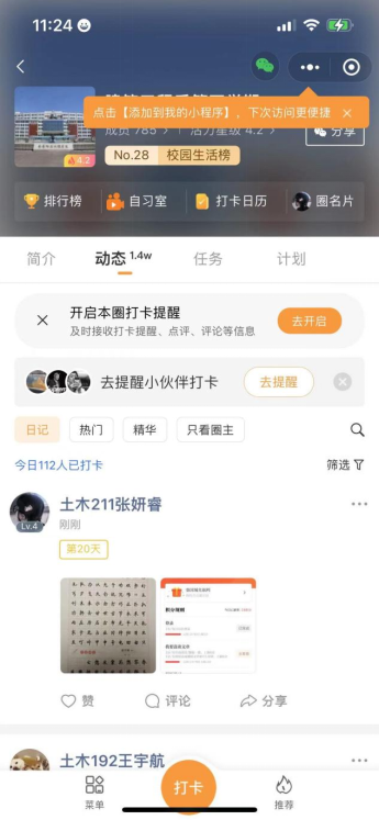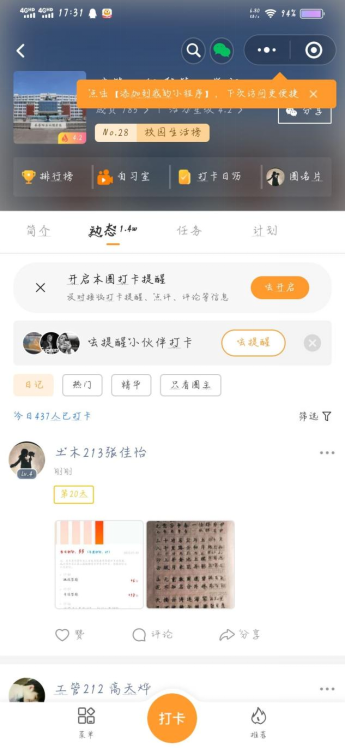 第四学期马上结束,我们小组成员张旭、张佳怡、殷悦、张妍睿都能按时认真完成本周任务。都会按时打卡,每日完成130字以上的字帖一页,学习强国,居家锻炼等学校任务。并且会进行公益活动,读书交流,专业项目等活动。