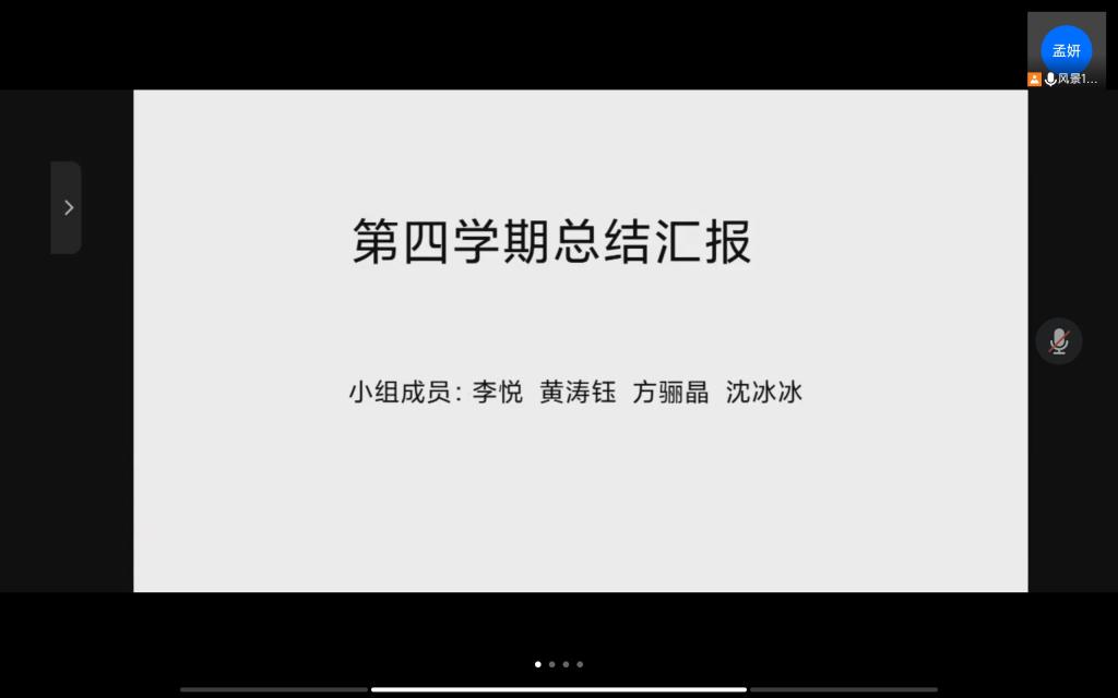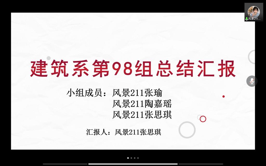 今天下午七点,开展了由张怡老师组织的第四学期总结会议,有风景园林张怡老师组所有同学共6个小组即21人参会。