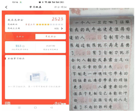 第四学期最后一周即将结束,本小组进行了总结交流,确定了本学期的全部任务已经完成。其中包括长仿宋体、刚楷临摹、读书交流心得、学习强国、志愿者服务、居家锻炼,感恩实践等,在完成这些任务的过程当中成员积极努力,小组成员胡帅在居家锻炼表现良好,积极锻炼。许方舟在学习强国方面按时打卡完成,积分远超过任务积分。程卫东感恩实践表现优异。李欣茹在志愿者服务的时候积极热心,认真仔细。其次。我们在书写汉字的同时,也可以静心,提高书写能力,使我们对中华文化有深厚的了解,锻炼可以强健体魄,使人精神焕发,学习强国的同时可以让我们对国家的事情有全新的认知,所谓少年强则国强,少年智则国智。感恩实践让我们懂得如何对待生活,热爱生活,充满热爱。积极乐观的尽自己的力量去回报社会。读纸质版书可以让我们静下心来认真阅读,丢下过于依赖的电子产品,走进书中,体会故事人物的悲欢离合,在不断增长知识的同时,也开阔了思想世界,通过这些项任务的完成,使我们小组成员受益颇多。