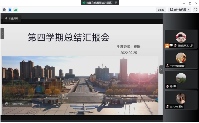 2月25日晚六点半,生涯导师夏瑞通过腾讯会议召开了第四学期总结汇报会,各组组长与成员共计17人参会。此次会议开展的目的是通过各小组第四学期总结汇报,检查学生第四学期的完成情况。