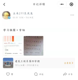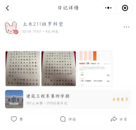 转眼间,第四学期已经进行到了第六周。在这六周的时间里,学校为了丰富我们的假期生活为我们开展了各类活动,在锻炼我们的同时也增强了我们各种能力。在组长罗科莹的带领下,我们小组成员每天完成至少一页钢帖临摹以及50分以上的学习强国,练字可以修养身心,陶冶情操,而每天的学习强国更是可以让我们了解时事,学习新时代各种理论思想。