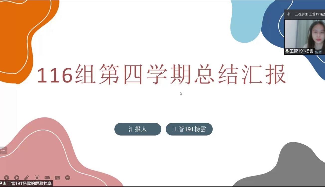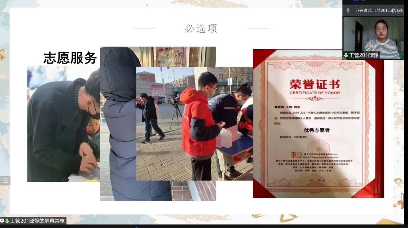会议开始,生涯导师郝丽娜首先对第四学期整体情况进行总结说明,并对优秀的做法及事迹进行了表扬,同时也指出了存在的问题及改进措施,说明此次线上会议的原因以及目的。各小组按照顺序依次进行汇报,汇报人积极、紧张、热情的汇报着自己小组成员们在第四学期的完成的情况,展示必选项和素质提升项成果。生涯导师郝丽娜老师、党员学长张梦瑶,组长杨雲对大家的汇报情况进行分别点评指导,提出了同学们在第四学期开展的不足与期望,告诫同学们严格要求,完善自我,在不足中有所提升,努力做到最好。