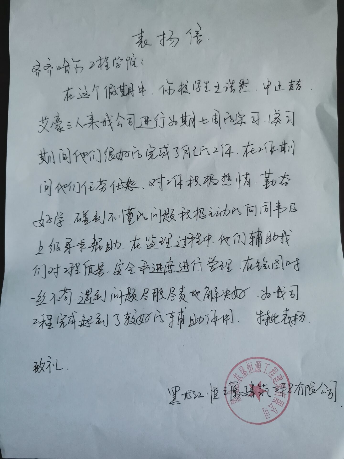 2022年6月13日至2022年7月29日期间,我校工管202班王浩然、申正喆、艾豪在在黑龙江恒源建筑工程有限公司进行第三学期实习工作。本次实习我校三名同学较好地完成了领导交代的工作,得到领导表扬信一封。