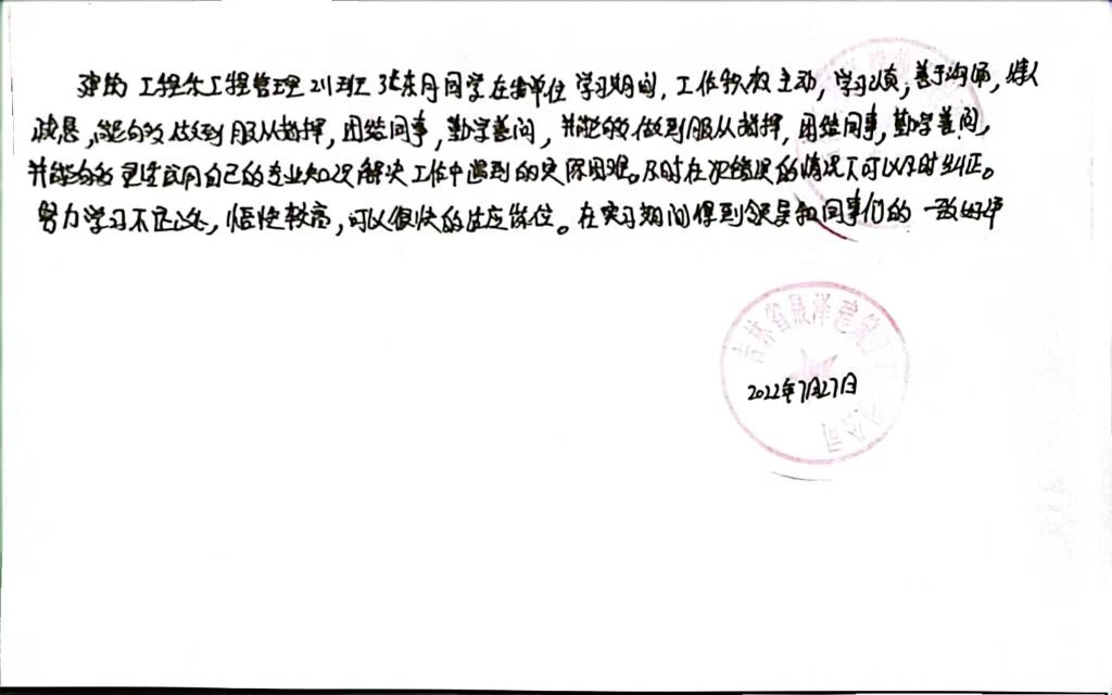 在2022年6月-7月的专业实践中,建筑工程系工管211学生张东月在实习期间发扬了吃苦耐劳、勤奋好学、严于律已工作作风受到吉林省晟泽建筑有限公司的表扬。