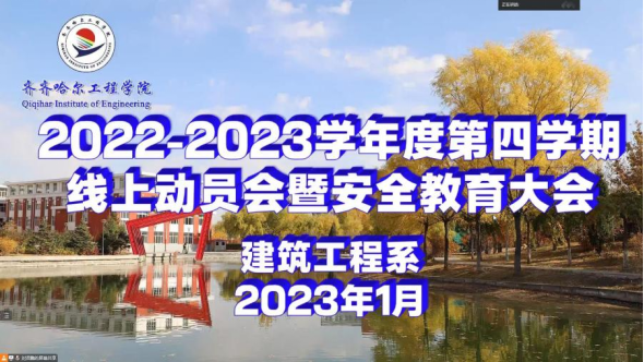 为落实《齐齐哈尔工程学院2022-2023学年度第四学期实施方案》的相关要求,践行立德树人,加强社会实践教育,落实劳动教育,深化教育教学改革,丰富学生的社会阅历,增强学生的社会责任感及人文修养,提高学生的综合素质,培养应用型、职业型的创业者,建筑工程系于2023年1月4日通过腾讯会议的形式召开第四学期线上动员会暨安全教育大会。