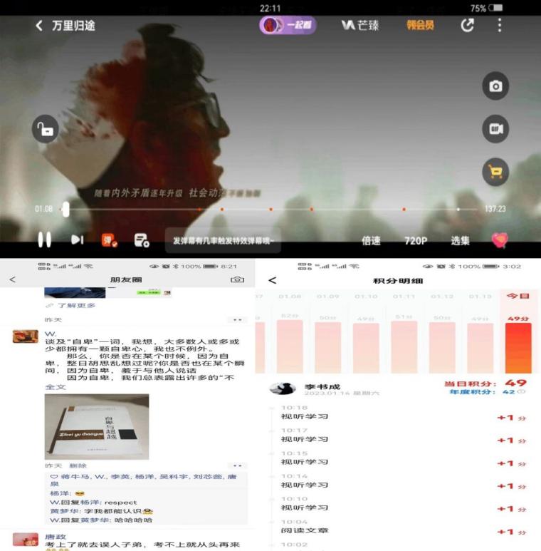 这是第四学期开始的第二周,在本周一小组成员陈江,陈贻民,李鑫包括我通过视频通话的形式,确定了本周的内容为读书交流与爱国主题影片观赏。与此同时临摹字帖和学习强国作为硬性要求,每周每天都按时完成。