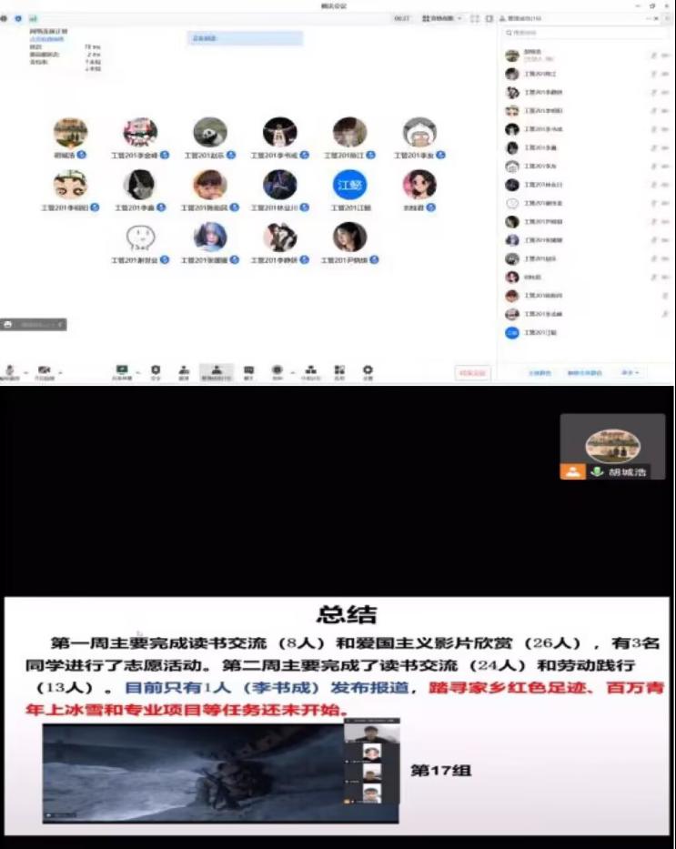 本次会议由工管201班班长和第四学期小组组长共同参与,学长胡城浩根据项目完成情况,对读书交流、爱国主义影片欣赏和劳动践行等项目活动进行总结,建议同学们可以进行网络线上会议进行交流,分享读书心得和观影感悟,让同学们更加积极参与劳动践行活动。根据项目进度,要求大家从“踏寻家乡红色足迹”、“志愿者服务”以及“百万青年上冰雪”三个项目选择适合自己的项目进行完成,帮助同学们规划好第四学期计划安排。