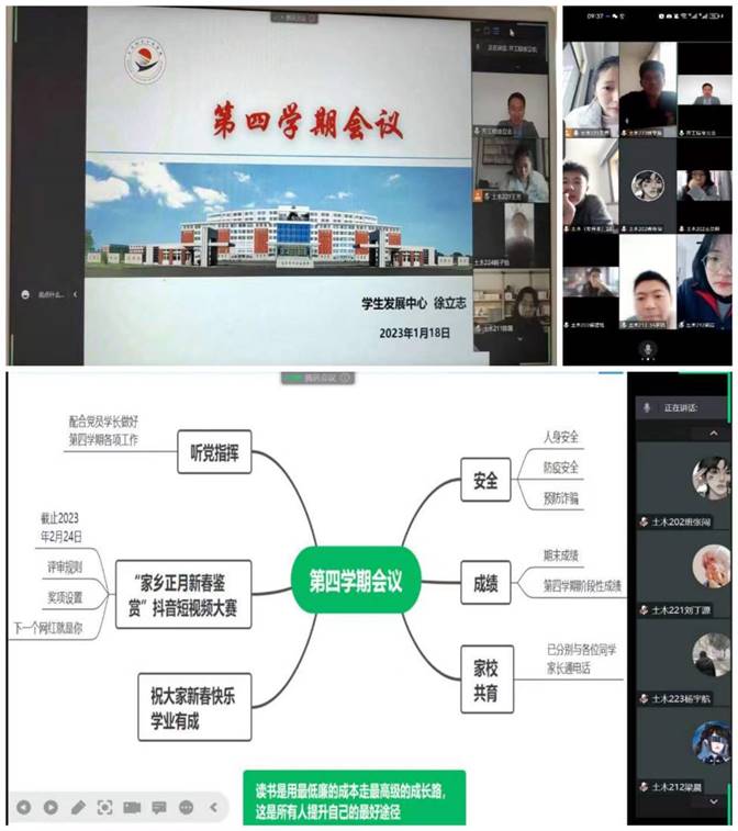 徐老师主要讲了假期安全、期末成绩、家校共育、听党指挥、“家乡正月新春鉴赏”抖音短视频大赛等五个方面内容。其中安全方面提醒大家注意人身安全、防疫安全、预防诈骗等,希望大家提高防范意识,保证自身安全;徐老师密切关注着我们的期末成绩,希望不及格的同学能利用假期时间,好好补习功课,仅在学习强国这一考核内容上,徐老师以身作则,带领大家一起学习一起“晒分”,涌现出了一部分优秀学生,表扬优秀学生的同时激励大家积极配合好党员学长的工作,按时完成第四学期各项任务;在家校共育方面,徐老师已经跟绝大部分学生家长进行了电话联系,让家长也能知道孩子在学校的各方面情况,家长与老师携手共同培养学生;徐老师鼓励大家积极参加抖音短视频大赛,锻炼自己,也希望能涌现出网红选手。