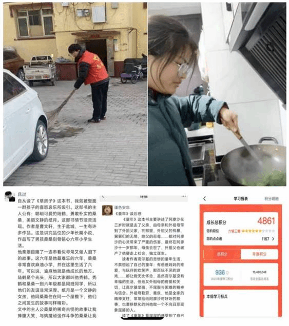 在本周小组组长王涵参加了由所在社区举行的老旧小区环境整理工作,主要的工作有对清扫地面上的白色垃圾、铲除墙面小广告。小组成员刘惠科、黎小庆完成了劳动践行的活动。本周小组内部组织了读书分享的活动,小组成员黎小庆为我们分享了《童年》并做出了读后感悟。