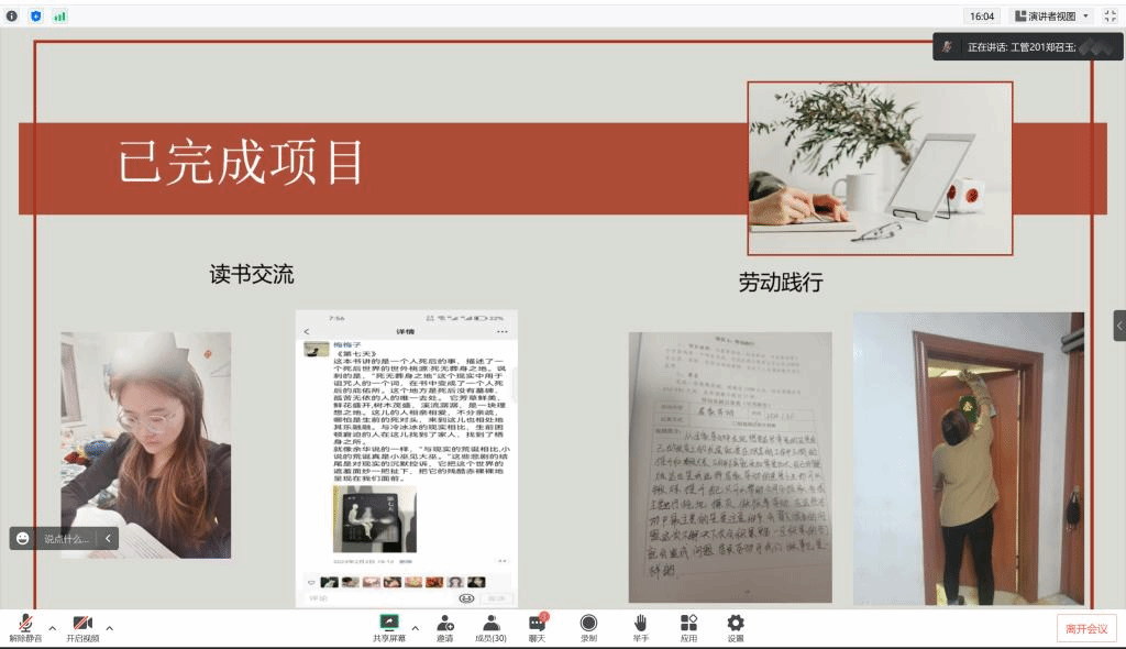 会议开始,郝丽娜老师对上一周各位同学的任务反馈情况进行总结,并指出了存在的问题与整改建议;接着,郝丽娜老师让同学们开始第四学期阶段总结汇报,首先由工管201班郑召玉同学开始汇报,其他同学依次按照在线表格的顺序进行汇报,在汇报的过程中,郝丽娜老师进行了点评并对汇报中有问题的内容进行了指正,其中,工管201班杨国明同学的社会实践内容非常有价值意义,郝丽娜老师也提出社会实践可以增强我们的责任感与使命感,可以尽快的适应社会,提高服务社会的能力;最后,郝丽娜老师对本次第四学期阶段汇报做出了总结,同时,也提出了目前所存在的问题,在接下来的第四学期学习中应有计划的去开展专业项目,提高报道的质量。郝丽娜老师还着重强调了本次第四学期开展的内容丰富多彩,新开展的美食烹饪实践课非常具有特色,希望有参加的同学在下次的汇报中可以展示出来。
