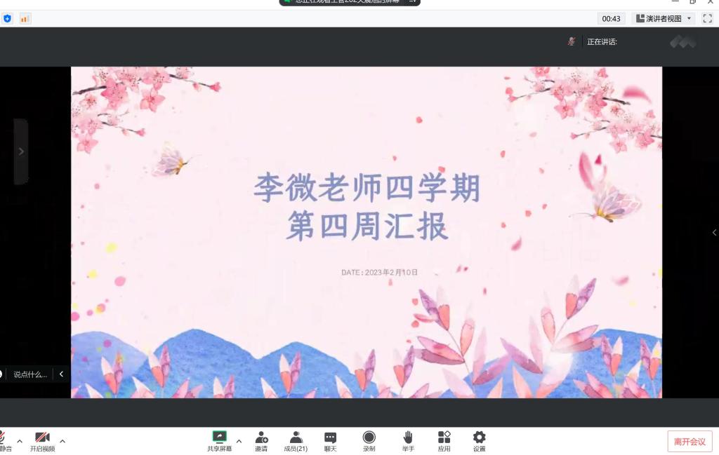 为了解同学们第四学期的进展情况,更好的督促同学们完成第四学期任务。2月10日9点,召开第四学期第四周汇报会,由关晨旭同学主持会议。在会议中,汇报的小组都认真将第四学期中期任务成果进行了总结,并对后期进程进行了合理的规划。李微老师耐心的对汇报的小组都进行了指导,督促同学们认真完成任务,留存好照片等佐证材料。在会后李微老师根据小组情况,对各组组长进行会议复盘,发挥好组长的作用,更好的加强了同学们互帮互助,及时督促的良好习惯,顺利完成第四学期。