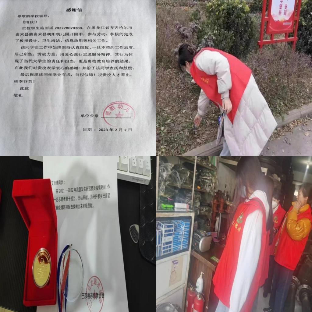 施丽瑶同学在当地幼儿园开学前参与劳动,在园长的带领下完成卫生清洁等相关工作,为孩子们提供了良好的学习环境。艾炎博同学在此次疫情期间勇当一名志愿者,在疫情面前舍弃小我,保全小区居民的安全,帮助医护人员以及社区服务人员一起战胜病魔。隋环宇同学,在当地社区积极参加社区消防知识讲座,跟随社区工作人员一起走访,让更多人了解消防知识。张紫嫣同学,在当地积极参加了社区举办的街道卫生活动,了解了城市清洁的重要性,更感受到了爱护地球的责任感。