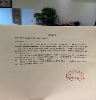 志愿者活动是倡导团结友爱、助人为乐、见义勇为的社会风气,是当代中国社会主义一向十分高尚的事业。体现了中华民族助人为乐、扶贫济困的传统美德,是大有希望的事业。努力做好这项事业,有利于全社会树立奉献、友爱、互助、进步的时代新风范。土木212马钰峰在齐齐哈尔市讷河市进行志愿服务活动。