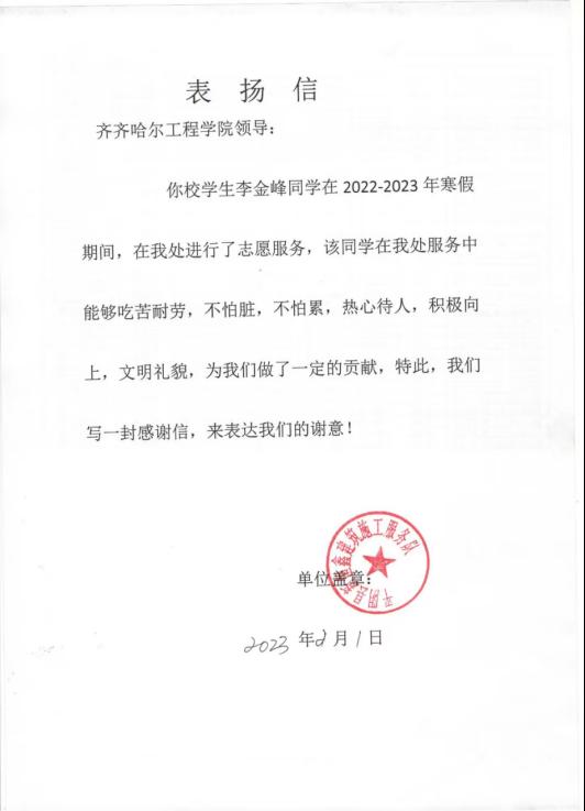 第四学期是学生接触社会服务社会的一种尝试,学生在寒假期间锻炼自己与人交流,为人服务的能力和意识,这是在课堂上收获不到的。,在本周GL-003小组工管201李金峰进行了志愿服务。