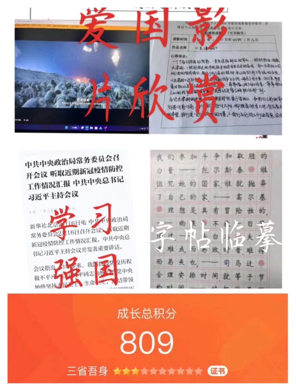 每个成员都抓紧第四学期提升自己,努力为以后的学习生活打下基础。在第五周里,几位小组成员学习强国的作业,通过“学习强国“平台的学习,提升学习能力,既能提高党性修养,又可以增加学习内涵,了解更多关于党的知识。将之前做的不好的地方进行改正,查漏补缺,积极认真完成。大家也都认真的做好学业规划,为自己的下一学期设立目标,并朝着目标努力奋斗!