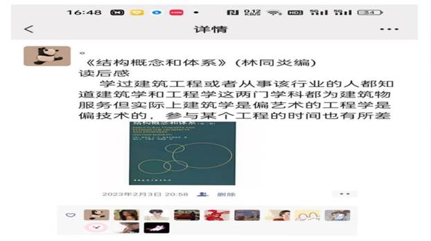 在第四学期的第五周项目实施的过程中,小组成员在每天学习强国、钢楷临摹、劳动实践的基础上本周还进行读书感悟,通过腾讯会议的形式进行分享,由组长工管201李明阳组织,组长首先进行分享本次阅读作品《朝花夕拾》,组员工管201贺体银分享本次作品《活着》,组员工管201林业川分享阅读作品《老人与海》,组员工管201李友分享阅读作品《平凡的世界》,其中工管201林业川主动积极分享自己所读的图书情况,他本次读的是洗涤心灵的书籍,在现实生活中,碰到困难是难免的,最重要的是要勇敢面对,有坚持不懈的精神,从失败中吸取教训。回想自己,每当碰到一点点困难就不耐烦,当失败时就好比泻了气的皮球。在日常生活中,我们经常会因考试的失败而失落,对自己没有信心;也许会因为朋友的背弃而伤心,自暴自弃。