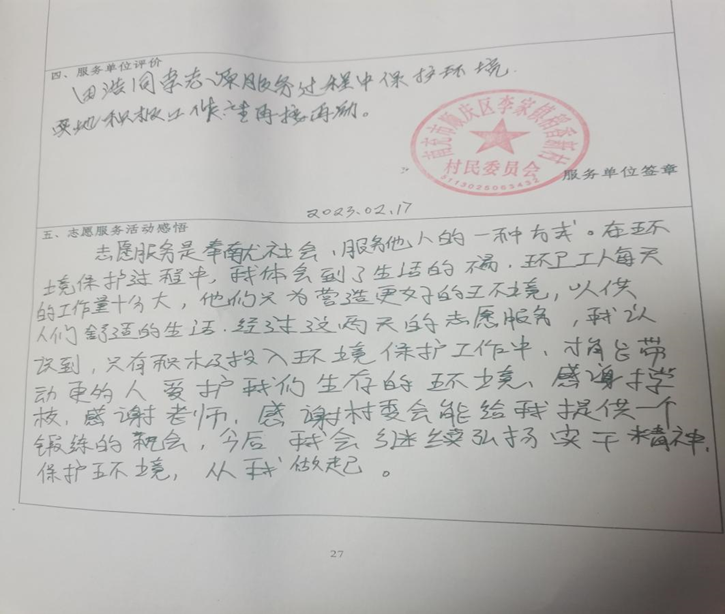 志愿服务是奉献社会,服务他人的一种方式。在环境保护过程中,我体会到了生活的不易,环卫工人每天的工作量十分大,他们只为营造更好的环境,以供人们舒适的生活。经过这两天的志愿服务,我认识到只有积极投入环境保护工作中才能带动更多的人爱护我们生存的环境。感谢学校,感谢老师,感谢村委会能够给我提供一个锻炼的机会,今后我会继续弘扬实干精神,保护环境,从我做起。