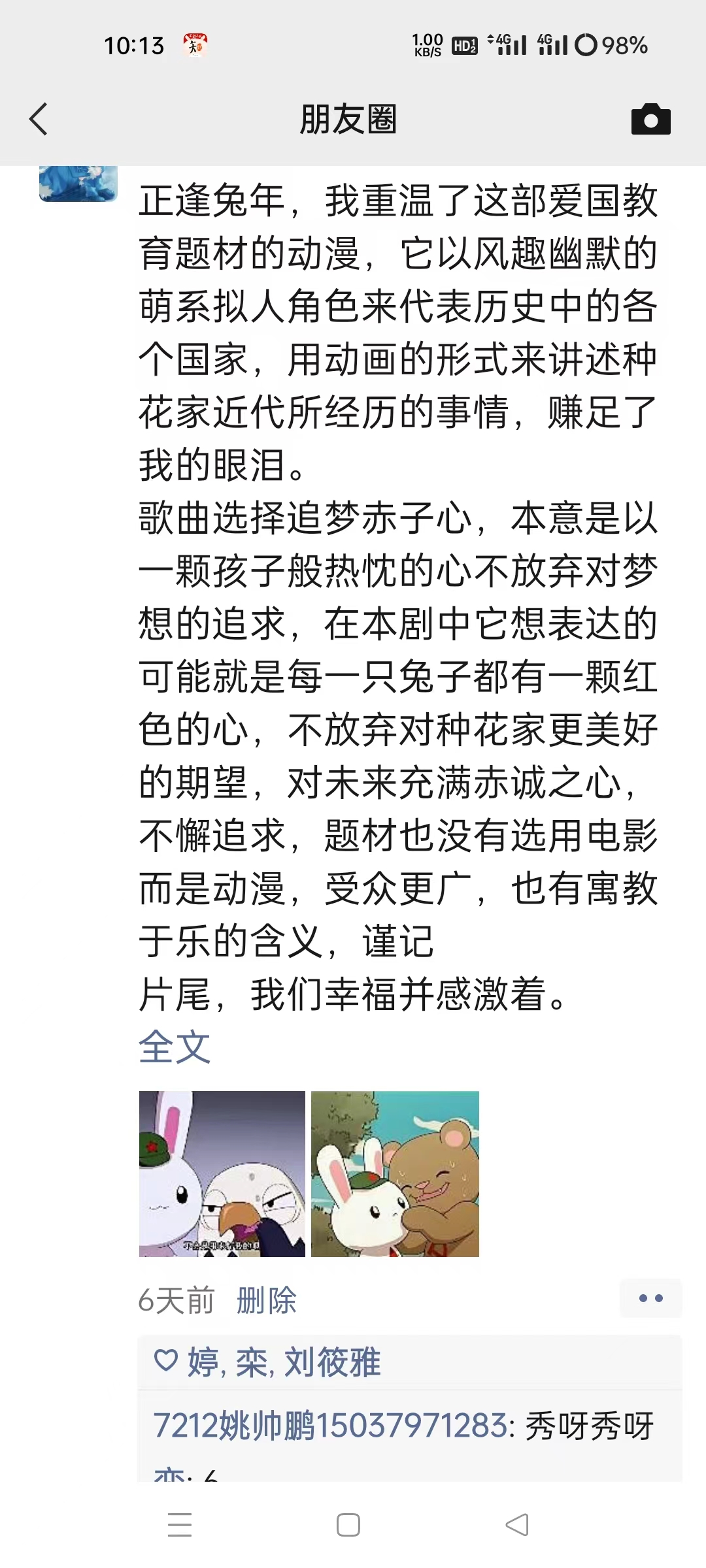 在休闲时间,我还观看了《那年那兔那些事》,它是一部关于爱国历史题材的动画,以轻松幽默的方式来展示新中国的历史事件,而我最喜欢的是它的主题歌曲《追梦赤子心》。歌词本意是说要以孩子一样热忱的心永不放弃对梦想的追求,也恰契合了我们新时代青年的心声——要有一颗赤诚之心,对于国家、社会更好的未来充满期望并努力。
