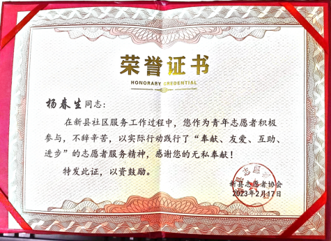 在活动结束后,我和几个朋友主动留在协会继续工作,进行社区的公益清理垃圾,清理小河边的杂草等。在短短的两周,我们认认真真的完成任务,充分得到了领导的认可,于2月17日给我们颁发了荣誉证书,同时也结束了我们的志愿服务之旅。