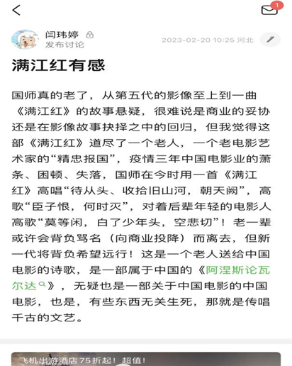 我还观看了爱国电影《满江红》在历史长河中,生命是无比短暂的,但是精神力量却是可以闪烁千年。在影片中,岳飞去世四年后仍然是张大这些小兵的信仰和灯塔。而九百年后,他九死不悔的爱国情怀,他“收拾旧山河、朝天阙”的碧血丹心,仍然让我们无比动容,难以释怀。岳飞的浩然之气深深地震撼着在场的每一个人,精忠报国的爱国精神将会永远激励着每一个国人,我们永远不要忘记。