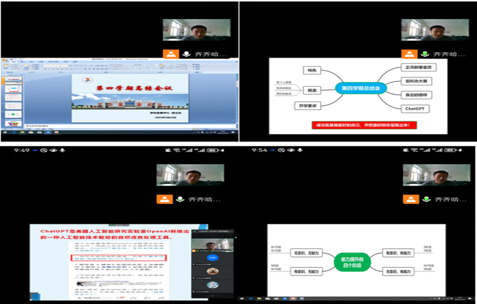 会上,徐老师指出了总结要有特色、表扬了优秀的学生、新学期要多参加各种级别的大赛、“ChatGPT”上线带给我们的反思等七个要点,并对每一个要点深度分析,以便于这些与未来的学习生活联系在一起。在这期间,徐老师强调了特色的重要性,并指出GhatGPT上线给我们带来的挑战及今后如何做好就业规划应该认真的反思。徐老师在表扬优秀的学生时引出了能力提升的四个阶段,通过互动,让我们知道无意识,有能力才是最高级别,身边的榜样在无意识的情况下,却有能力完成突然下发的上交第四学期总结任务,在这种突发情况下能够完成目标,说明有规划并提前做好了安排,面对突发事件有能力应对。