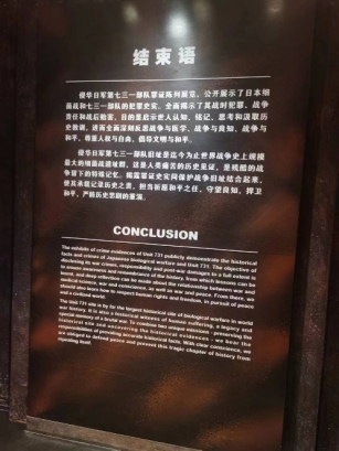 其中一项的劳动践行让我感受颇深,帮助父母在院子里扫雪,在这项活动中,锻炼了自己的能力,在劳动中成长,在劳动中学习,充实了自我,真正地走出课堂。去帮助家人,让家人享受自己的成果,使自己陶醉在喜悦之中,有时会很累,但更多的感觉是我在成长。在踏寻家乡红色足迹中,我前往到了侵华日军第731部队遗址,由于馆内禁止拍照,我只在参观结束的时候匆匆拍下一张结束语,揭露罪证史实同保护战争旧址结合起来,使其承载记录历史之责,担当祈愿和平之任,守望良知,捍卫和平,严防历史悲剧的重演。