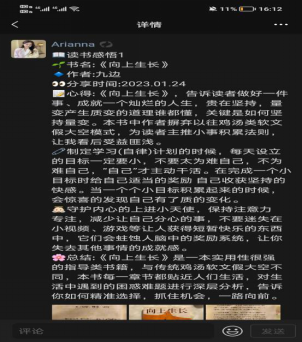 在这六周的时间里,我每天通过“学习强国”平台学习,既能提高党性修养,又能了解更多关于党的知识。同时在每天的字帖临摹下,自己的字迹有了很大的提升,也从字帖的书写中明白了字帖不仅可以练习字体,而且能磨练意志。在不断的学习过程中,及时进行不断的总结和反思是非常重要的。在完成学业规划之后,能够合理的安排时间,从而使学业达到最佳的效果。读书可以让我们获得更多的词汇量,在读书交流中,我获得了很多感触,也提升了自己的写作水平。