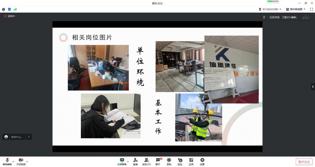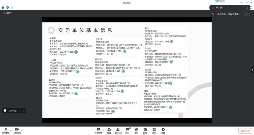 6月25日晚,在李俊老师的主持下,工程管理专业20级、21级、22级学生在线上进行实践学期第一周汇报,包括李微和宫寄程两位实践学期辅助教师以及李俊老师指导的各年级学生共38人出席会议。