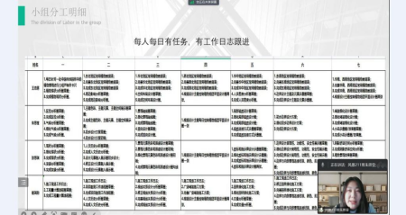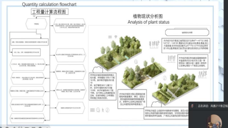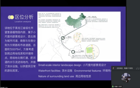 各组在汇报过程中针对每日作业和工作内容进行汇总展示,其中第三组出色的完成了前期的区位分析图、气候分析图、人文历史分析图以及植物现状分析图、主题元素、色彩和空间展示图草图等,学团队发散思维形成创意展示在分析图中,并在马老师的要求下将专业术语等内容进行翻译,同时能够对岗位工作流程进行针对性研究并制作工作流程图。