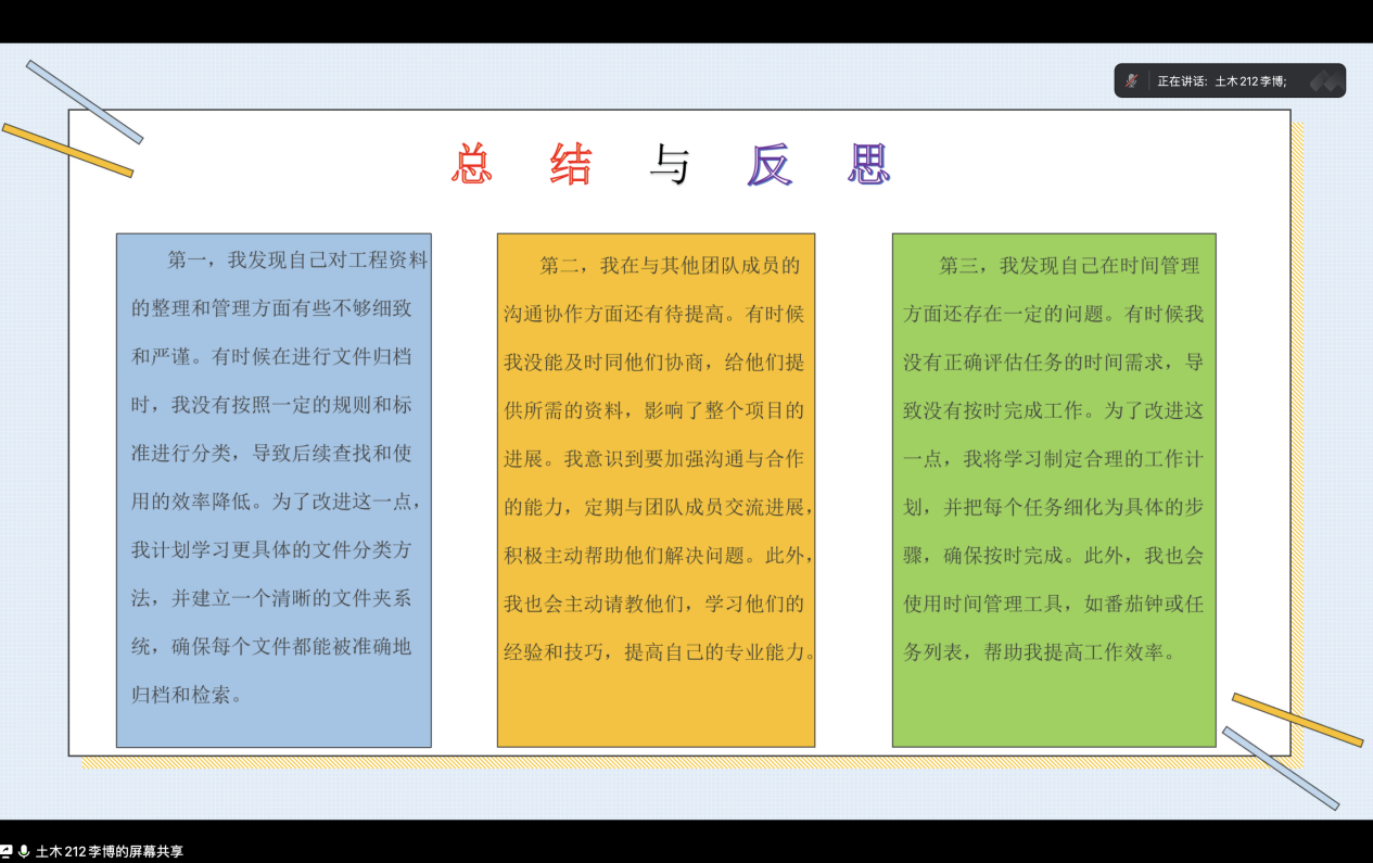 为确保专业实践学期有效开展,提高学生实践能力,7月2日19:30土木专业指导教师李月凤通过腾讯会议召开土木工程专业实践学期周汇报。本次会议由指导教师李月凤主持,土木工程专业27名同学全员参加。汇报以团队形式进行实习情况汇报,通过PPT进行实习成果展示、分享实习内容、收获与反思,并回答指导教师所提出的问题。